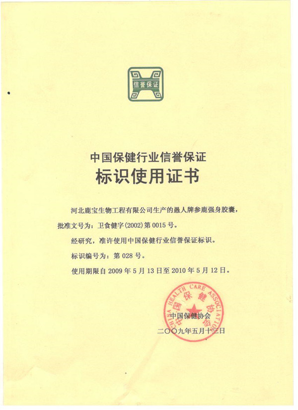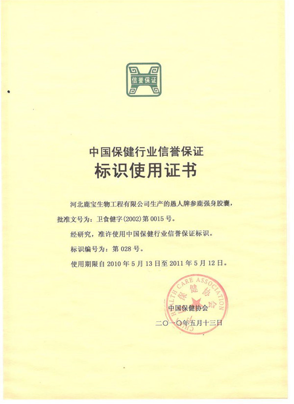 中國保健行業信譽保證標識使用證書
