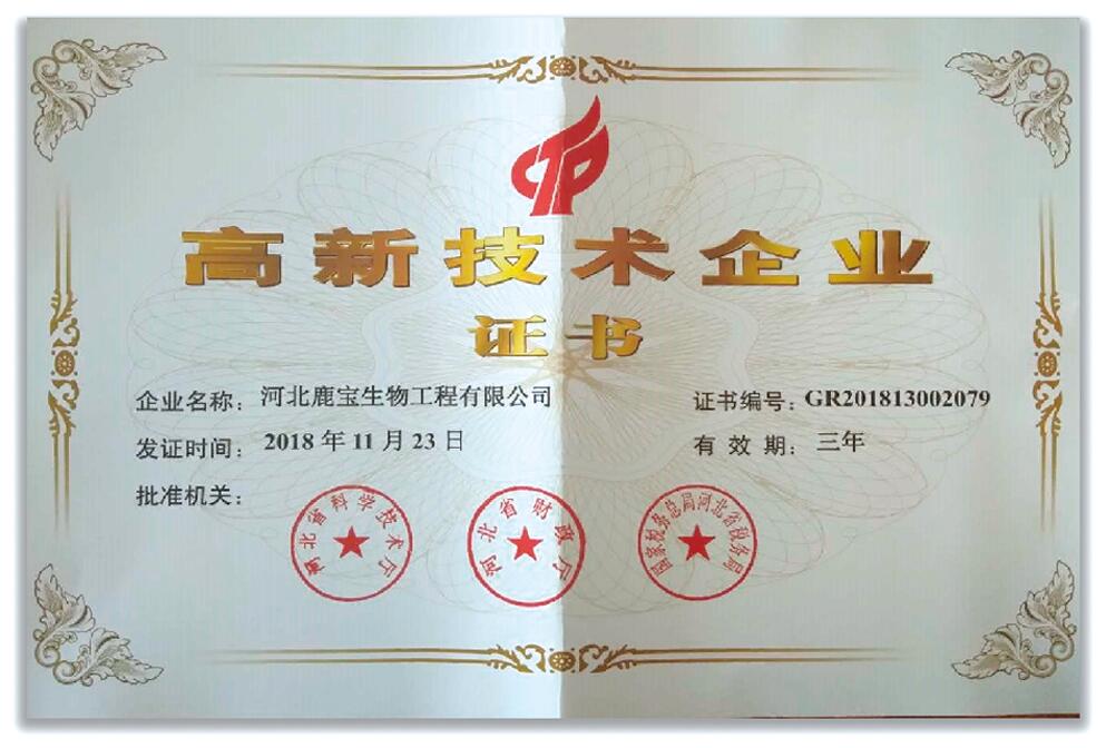 經省科委審評,河北鹿寶生物工程有限公司成為國家高新技術企業。